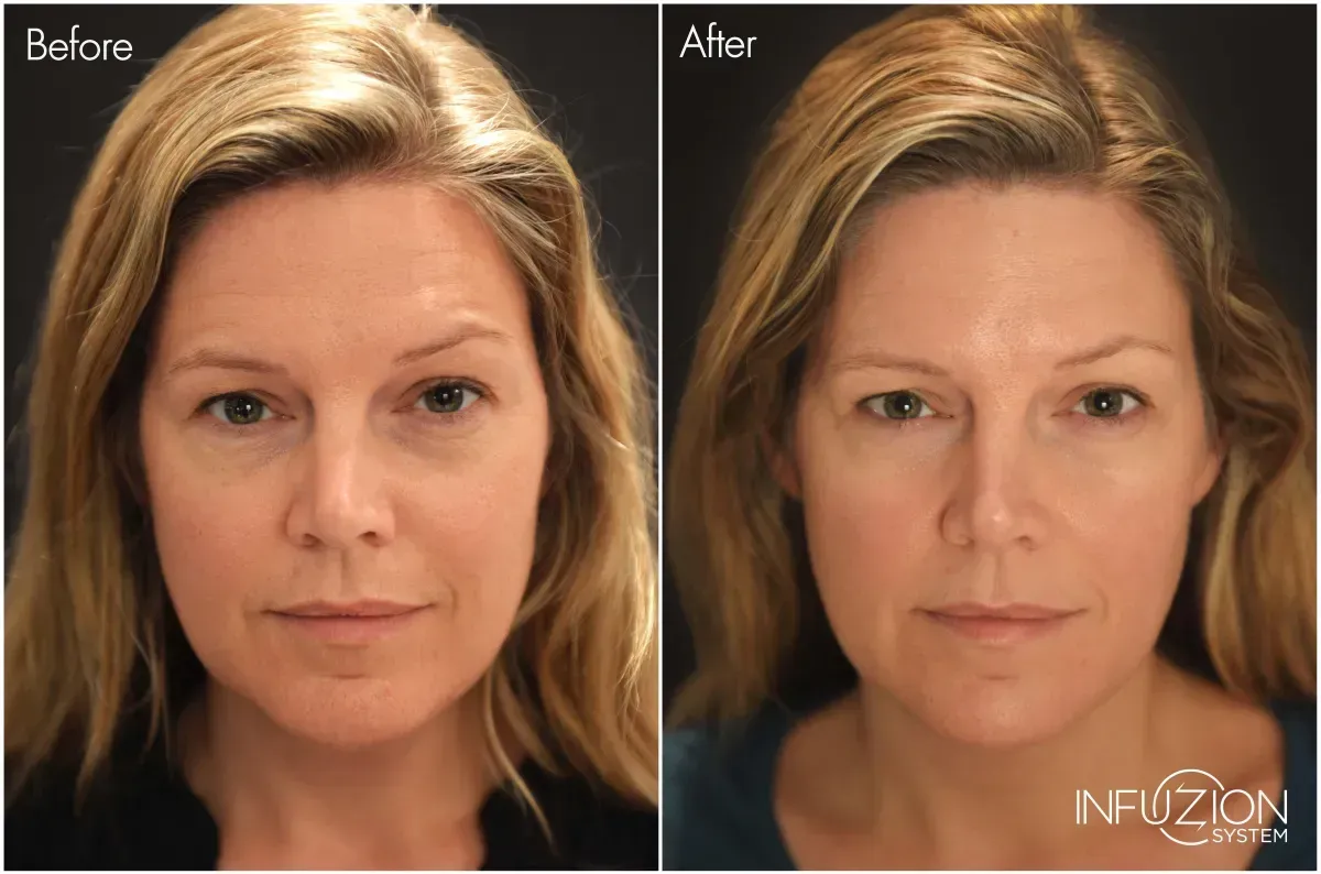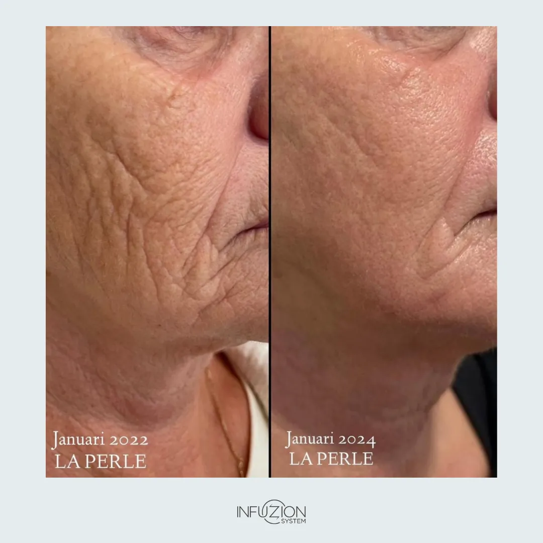 Zeker. Infuzion is speciaal ontwikkeld om fijne lijntjes en oppervlakkige rimpels van binnenuit op te vullen met hyaluronzuur — het lichaamseigen vochtmagneet.
